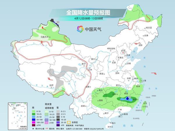 明天,內(nèi)蒙古東北部、西藏中東部、青海南部、新疆北疆北部等地部分地區(qū)有小到中雪或雨夾雪,其中,新疆北疆北部和北疆東部等地部分地區(qū)有大到暴雪,局地大暴雪。貴州東南部、湖南中南部、江西中北部、浙江南部、福建北部、廣西北部等地部分地區(qū)有中到大雨,其中,貴州東南部、湖南西南部、江西東部、福建西北部、廣西東北部等地部分地區(qū)有暴雨或大暴雨。