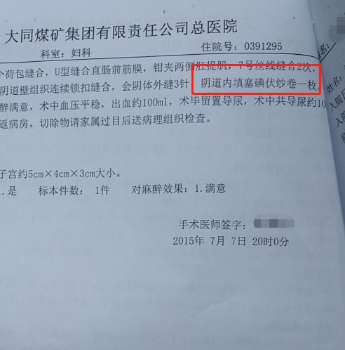 2015年7月,譚先生的母親曾在同煤集團總醫院婦科做手術。他提供的一份落款日期為2015年7月7日的手術記錄顯示,其母在大同市煤礦集團有限責任公司總醫院婦科做了“下行陰式子宮切除術+陰道前后壁修補術+尿道折疊術+盆腔粘連松解術”,縫合之后在“陰道內填塞碘伏卷紗一枚”。