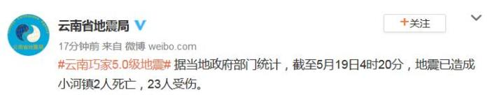 中新網5月19日電 據云南省地震局官方微博消息,據當地政府部門統計,截至5月19日4時20分,地震已造成小河鎮2人死亡,23人受傷。