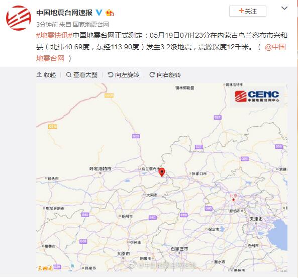 內蒙古烏蘭察布市興和縣發生3.2級地震 震源深度12千米
