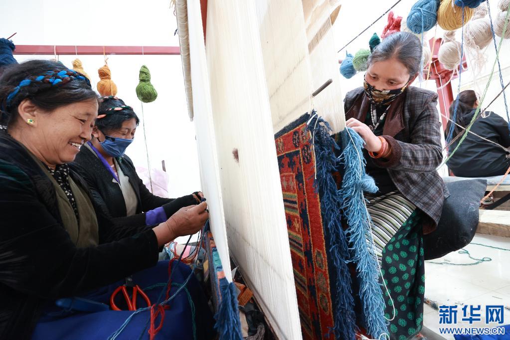 山南市瓊結縣農(nóng)牧民在襄陽援藏工作隊引進的西藏薩喜欽布公司編織藏毯(2021年6月18日攝)。(受訪者供圖)