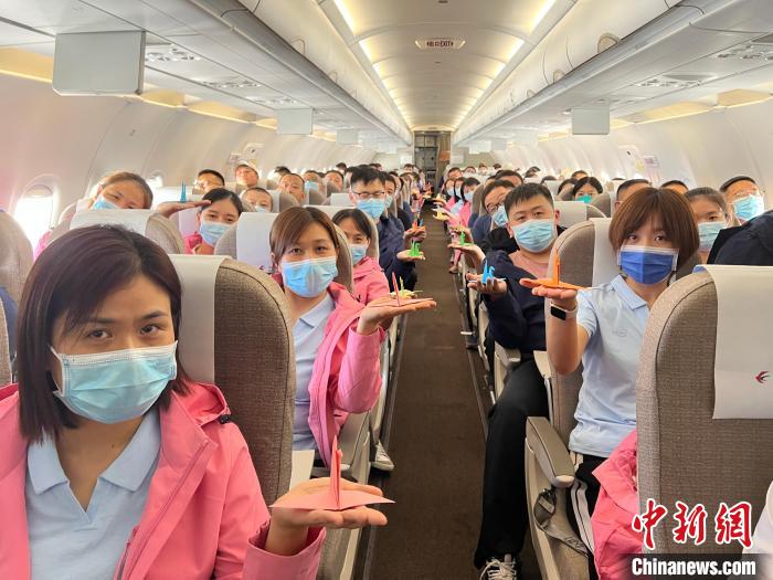 東航機組制作了寓意“美好、希望、祝福”的千紙鶴送給援藏醫護隊員,希望醫護隊員們平平安安歸來,祝福自治區各族同胞早日戰勝疫情。