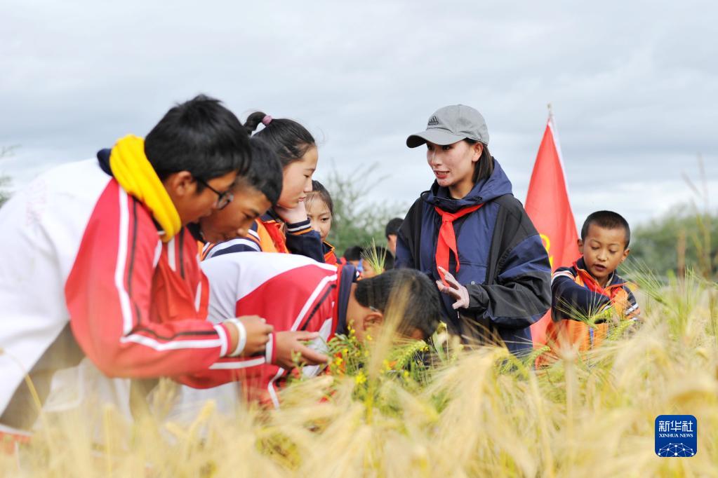 日喀則市上海實驗學校的學生們在青稞地里聽講解(9月17日攝)。新華社發(潘杰 攝)
