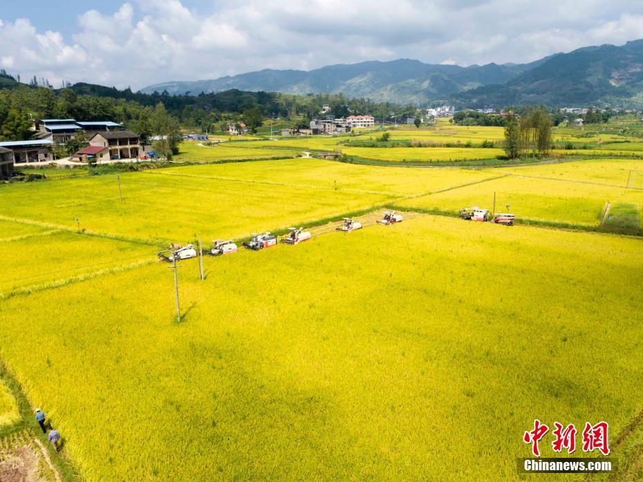 9月23日,2021年中國農(nóng)民豐收節(jié)·第一屆“天生云陽”金秋節(jié)在重慶云陽縣鳳鳴鎮(zhèn)拉開序幕。時下正是豐收的季節(jié),三峽庫區(qū)腹地重慶云陽縣的農(nóng)民門正忙著搶收搶曬,確保水稻玉米等農(nóng)作物顆粒歸倉。圖為在重慶云陽縣路陽鎮(zhèn),一字排開的8臺大型收割機(jī)正在稻田中收割成熟的水稻。劉興敏 攝