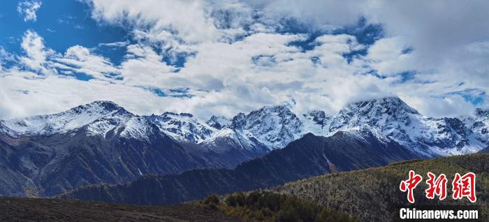 圖為銀白色白馬雪山與綠色植被勾勒生態(tài)畫卷。 張?zhí)砀!z