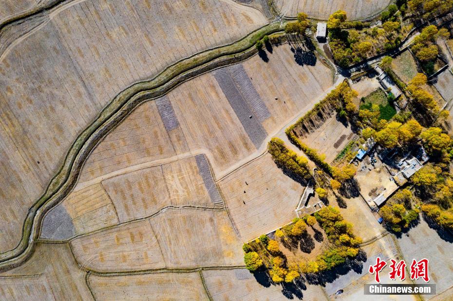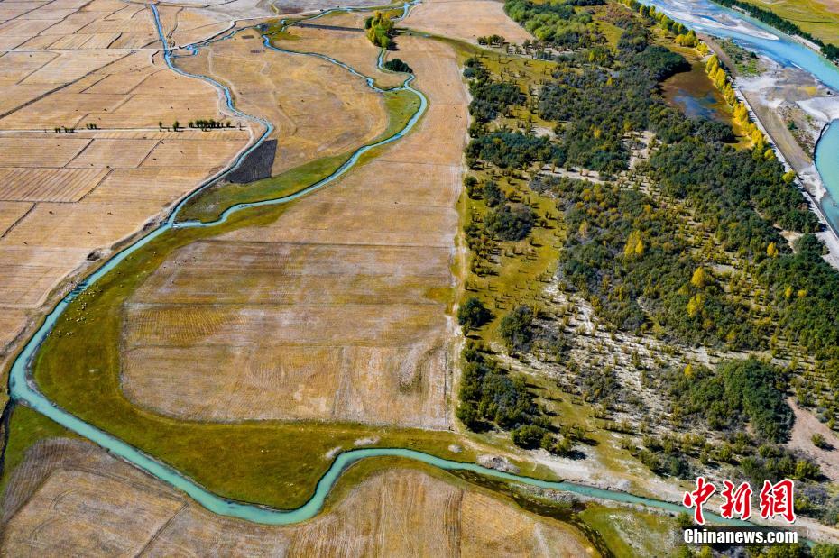 日喀則江孜縣境內農田、村居與金黃的樹林相映成趣。 何蓬磊 攝