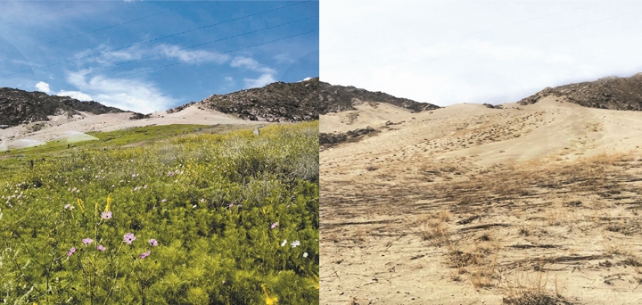 圖為空港新區(qū)防沙治沙與生態(tài)修復試驗項目中同一處坡面生態(tài)修復前(右)與生態(tài)修復后(左)的對比。拉薩融媒記者 凃 瓊攝