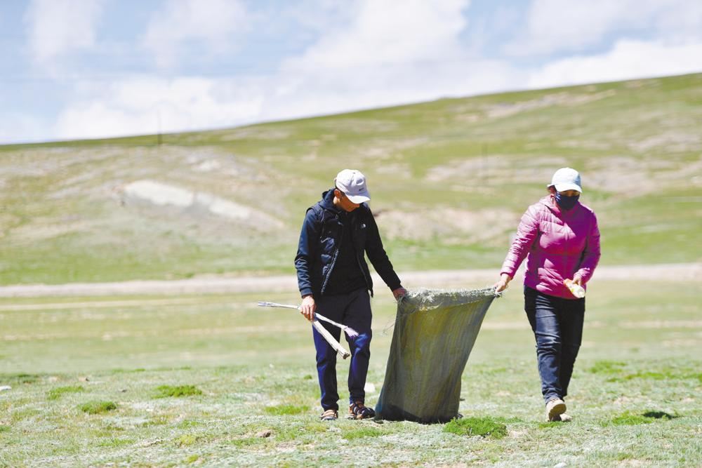 瑪多縣瑪查理鎮噶丹村,生態管護員索南吉(右)與才讓多杰在村子周邊的草原上撿垃圾。