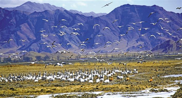 在冬日暖陽的照耀下,成群結隊的鳥兒在河面上、濕地里盡情嬉戲,赤麻鴨悠然戲水、斑頭雁低聲吟唱、黑頸鶴翩翩起舞……一派熱鬧的景象。