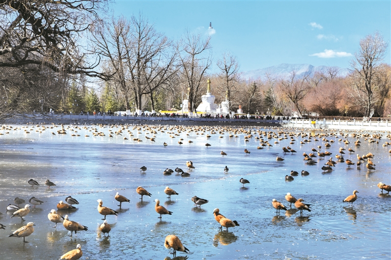 隨著天氣越來(lái)越冷,拉薩市宗角祿康公園里的人工湖已結(jié)了一層厚厚的冰,來(lái)自各地的候鳥(niǎo)像一群“精靈”,聚集在結(jié)冰的湖面,或嬉戲覓食,或展翅飛翔。