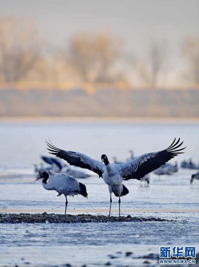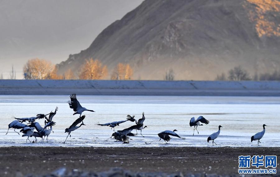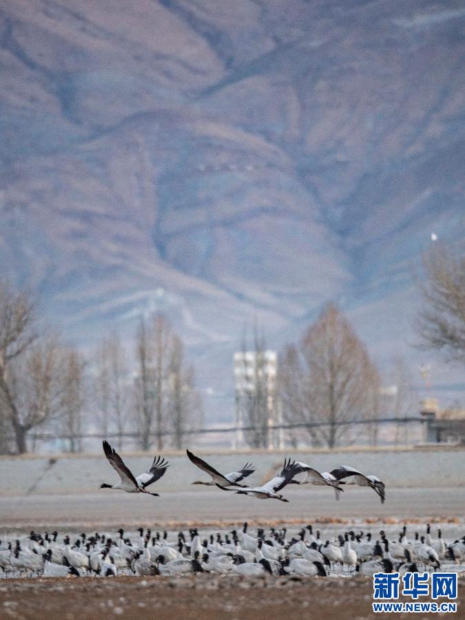 黑頸鶴在自然保護區里飛翔(2021年1月3日攝)。新華社記者 張汝鋒 攝
