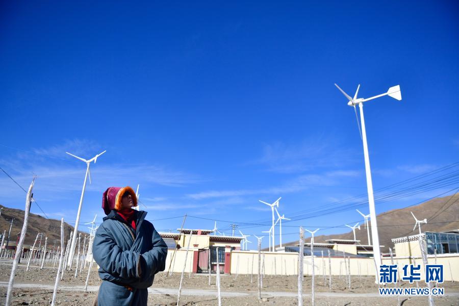 1月11日,隆亞村村支部書記貢保多杰在查看搬遷點的風力發電機組運行情況。新華社記者 張龍 攝