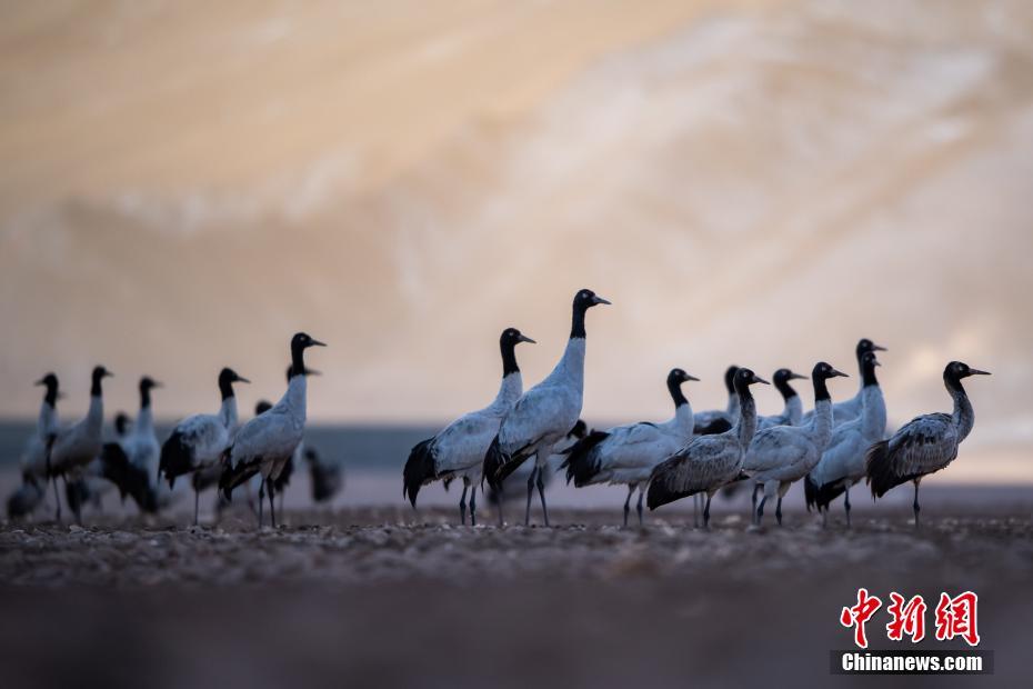 2月17日,西藏拉薩市林周縣黑頸鶴保護區內,黑頸鶴翩躚起舞、分外美麗。中新社記者 何蓬磊 攝