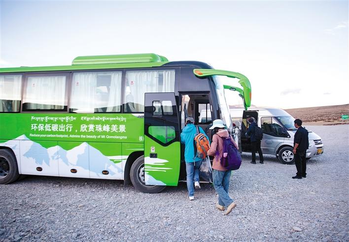 游客在珠穆朗瑪峰景區(qū)停車場轉(zhuǎn)乘環(huán)保客車(2019年5月16日攝)。珠穆朗瑪峰景區(qū)內(nèi)自2019年5月開始試運(yùn)營清潔能源環(huán)保客車,以進(jìn)一步平衡珠峰地區(qū)旅游發(fā)展與環(huán)境保護(hù)需要。新華社記者 孫非 攝