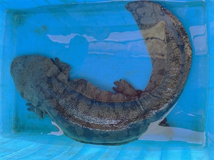 到達該店時,水產店老板宋保齊正在給“娃娃魚”喂食小魚,這條“娃娃魚”重14斤,長約95厘米。記者向宋先生了解了初遇“娃娃魚”的情況。宋保齊回憶起來還歷歷在目,他說:“清明節的時候,我和朋友們正在拉薩河曲水段游玩,意外在岸上發現了它,雖然我是賣水產的,但是當時也不能十分確定它是否就是‘娃娃魚’,然后我們就把它帶回了自家水產店飼養,在網上查看才確定它就是‘娃娃魚’,也是國家二級保護動物,便聯系相關部門,希望能把它放歸大自然。”