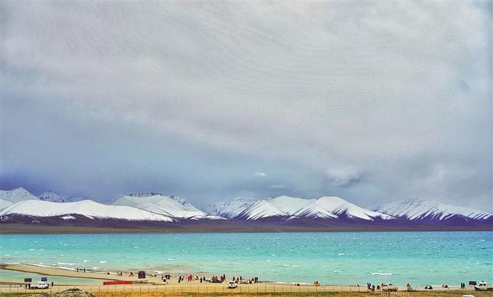 從羊八井出發(fā)至當(dāng)雄縣,有一條向左的岔路,沿著這條路一直向前開約60公里,就能到達(dá)西藏最著名的景區(qū)之一——納木措。納木措,湖面海拔4718米,形狀近似長(zhǎng)方形,東西長(zhǎng)70多千米,南北寬30多千米,湖的東南部是直插云宵、終年積雪的念青唐古拉山主峰,清澈的湖水便來自念青唐古拉山融化的冰雪,北側(cè)則倚偎著和緩連綿的高原丘陵,廣闊的草原繞湖四周,似是將納木措小心翼翼地護(hù)在懷中。湖水顏色由罕見的碧藍(lán)與碧綠色相結(jié)合,是畫師都不易調(diào)出的顏色,遠(yuǎn)遠(yuǎn)望去,碧波粼粼的湖水與周圍的山脈、草原、藍(lán)天、白云交相輝映,令在場(chǎng)的人不禁連連感嘆仿佛置身于仙境之中。