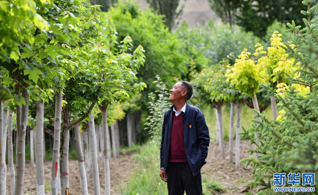 山南市扎囊縣某苗圃基地負責人邊久在查看基地內栽種的樹苗(7月20日攝)。新華社記者 晉美多吉 攝