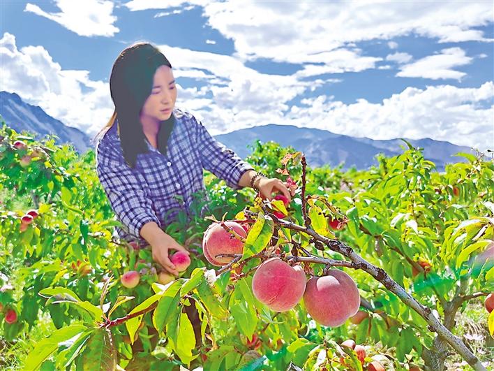 還未走進(jìn)桃園,桃子特有的清甜香味便撲鼻而來(lái)。當(dāng)?shù)毓ぷ魅藛T告訴記者,快熟了的桃子半青半紅,吃起來(lái)很美味。在他的指引下,記者摘下一顆白中透粉的桃子,這種已經(jīng)熟透的桃子,桃肉松軟,咬一口,清香又甜蜜的汁水就一涌而出,瞬間征服味蕾。