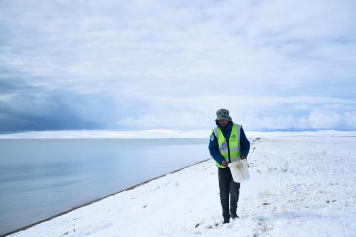 2021年10月,三江源國家公園黃河源園區生態管護員俄措在扎陵湖邊撿拾垃圾。新華社記者張龍攝