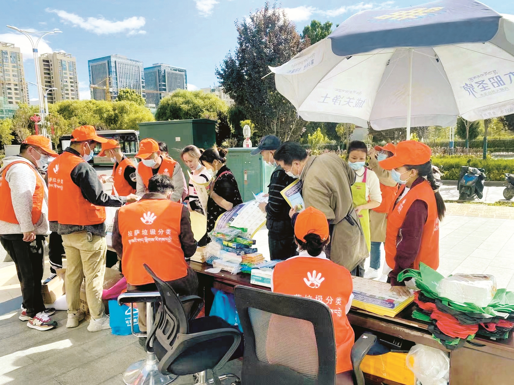 圖為工作人員向過往市民發放垃圾分類宣傳品。 (圖片由市分類辦提供) 拉薩融媒記者 范江英
