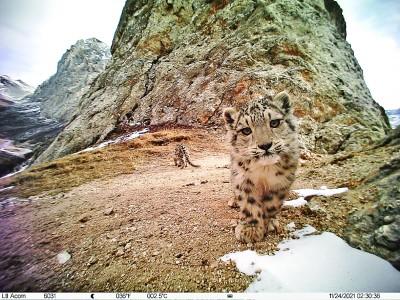 在世界屋脊研究野生動物,免不了直面挑戰。雪豹喜歡陡峭的石壁和山崖,因此安放紅外相機必須克服恐高心理。2021年10月,在云塔村爬山布設紅外相機時,我為了緊跟隊伍,沒來得及觀察周圍環境。當穿過灌木到達監測位點時,才發現自己站在山脊線上,背后就是幾十米高的斷崖,立馬嚇得眩暈蹲下。檢查并重新安裝好紅外相機后,我們又爬完兩座山才完成了一天的工作。這一趟,我們創造了為追逐雪豹一天內翻越3座山的紀錄。