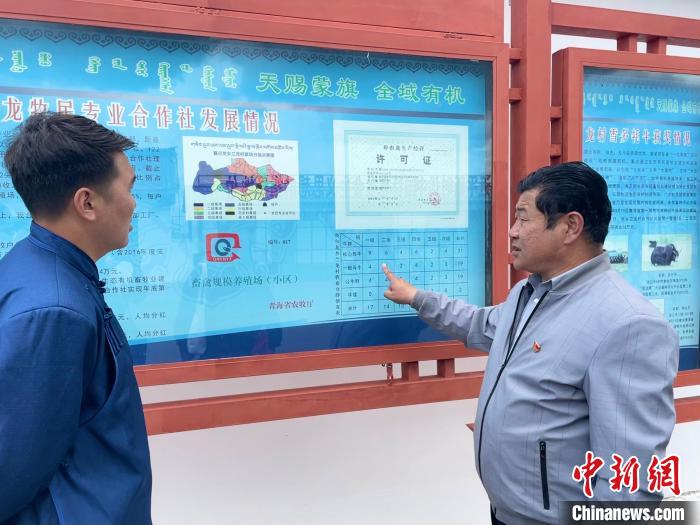 圖為河南縣農牧水利和科技局農辦項目辦主任才讓南杰(右)介紹合作社情況。祁繡娟 攝