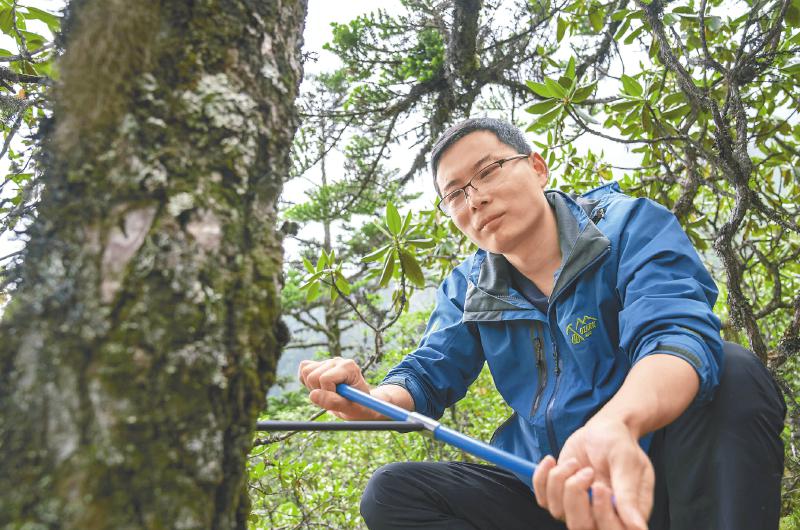 垂直距離只有300米,但密林中的行進并不容易。在向導帶領下,王文志和其學生抵達了林線處,腳踩松軟的苔蘚,他們展開作業。