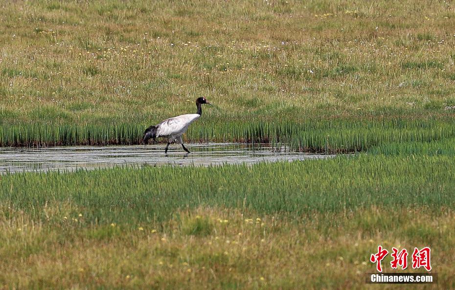 8月9日,祁連山南麓的青海省海北藏族自治州祁連縣央隆鄉,三只黑頸鶴正在央隆濕地悠閑踱步,不時發出鳴叫聲。黑頸鶴是大型飛行涉禽,頸的上部為黑色,故稱黑頸鶴。每年,黑頸鶴在春季遷徙到繁殖地,秋季到達越冬地,是世界上唯一生長、繁殖在高原的鶴。圖為一只悠閑踱步的黑頸鶴。 賈天勇 攝