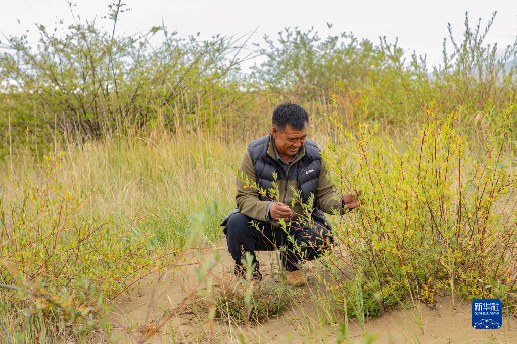 瑪曲縣自然資源局高級工程師馬建云在黃河瑪曲段干流沿岸的一處阻沙林帶建設區域觀察草方格沙障內植被生長情況(9月16日攝)。新華社記者 郎兵兵 攝