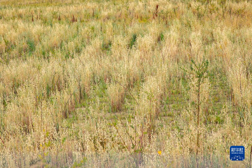 這是黃河瑪曲段干流沿岸一處阻沙林帶建設區域的草方格沙障內的植被(9月16日攝)。新華社記者 郎兵兵 攝