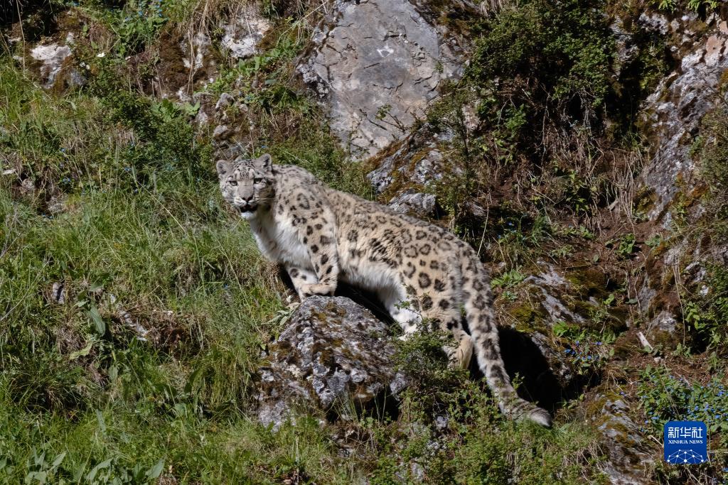這是在青海省玉樹藏族自治州雜多縣境內的昂賽大峽谷拍攝的雪豹(8月6日攝)。新華社發(姚牧陽 攝)