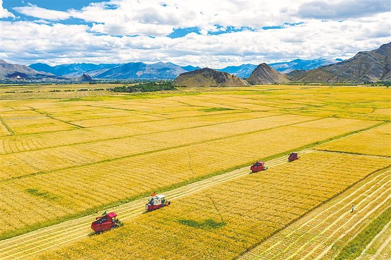 努力把資源優勢轉化為發展優勢,做大做強高原特色產業,加快構建現代產業體系。2012年至2021年,城鎮居民和農村居民人均可支配收入分別從18362元、5698元增長至46503元、16932元。圖為西藏自治區江孜縣紫金鄉青稞種植喜獲豐收。