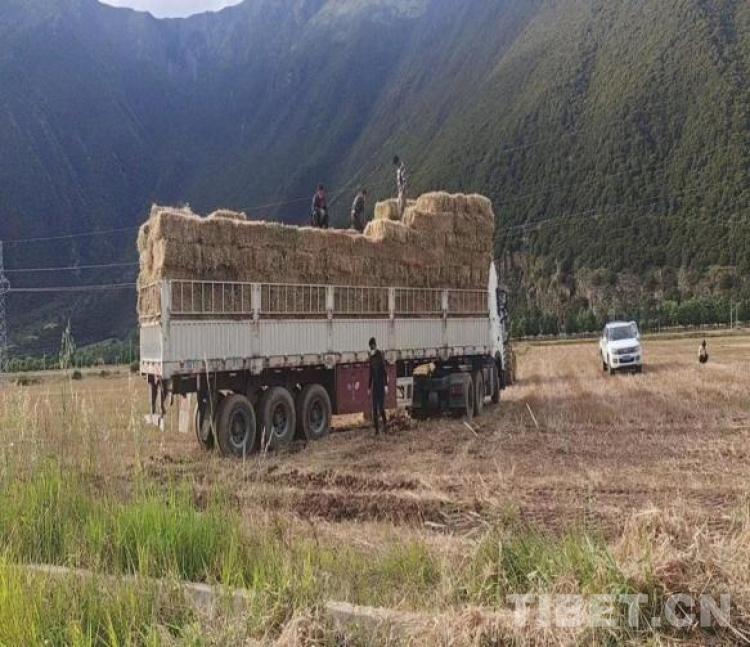 圖為國家牧草產業技術體系拉薩綜合試驗站工布江達縣示范點秋收搶收(海拔3990米)打捆裝車的牧草