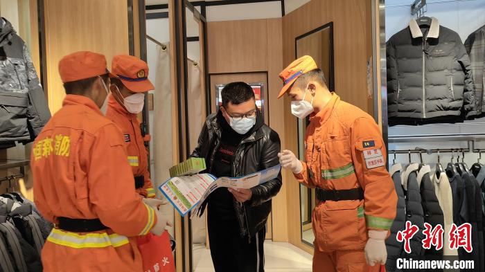 消防隊員正在向商家講解防火知識。 袁永斌 攝