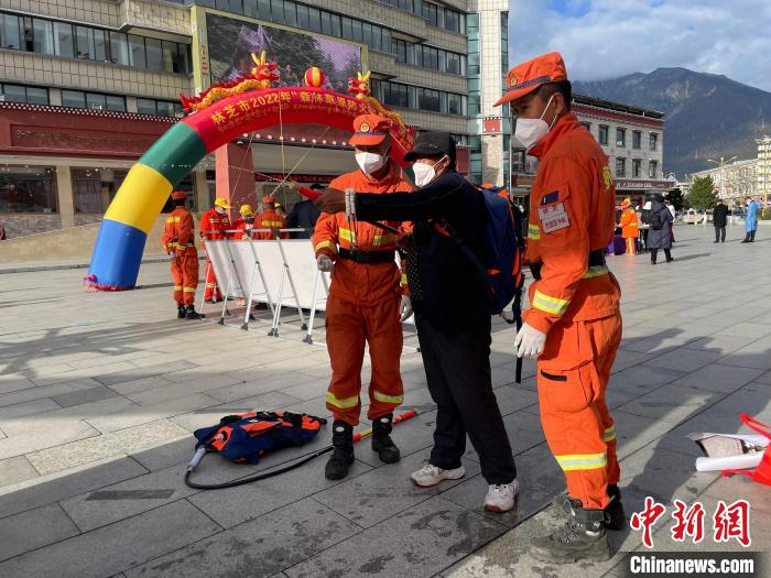 消防隊員正在教授裝備使用方法。 袁永斌 攝