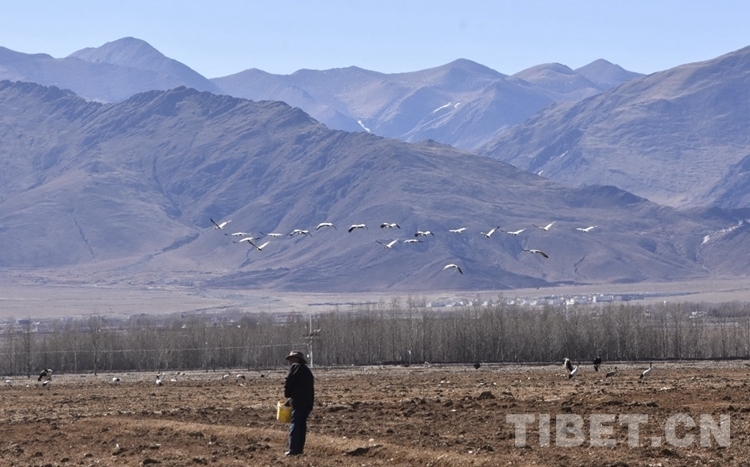 中國西藏網訊 地處雅魯藏布江中游河谷地帶的西藏自治區拉薩市林周縣,被稱為拉薩“糧倉”。每年的冬季,林周縣虎頭山水庫因兩面夾山,周邊有大片的良田,成為黑頸鶴覓食、夜棲的佳地。