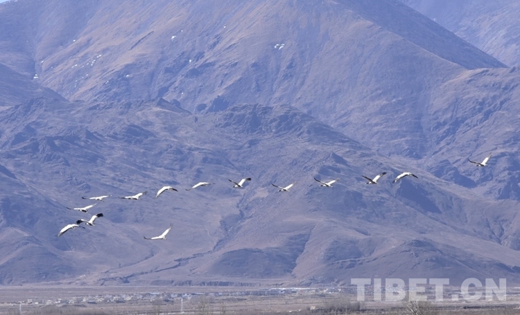 圖為1月18日,西藏林周強嘎鄉附近一群黑頸鶴飛過 攝影:次旦拉姆