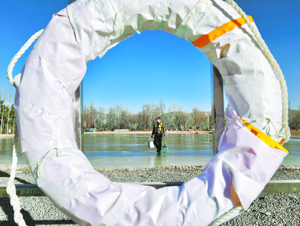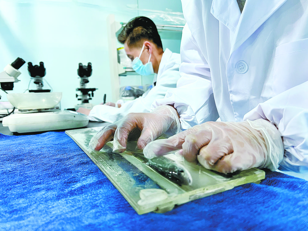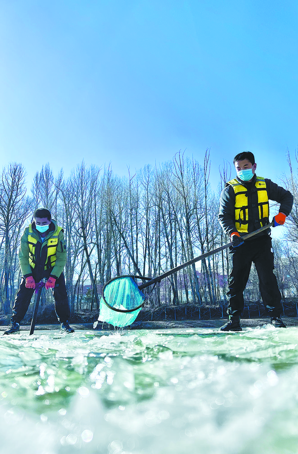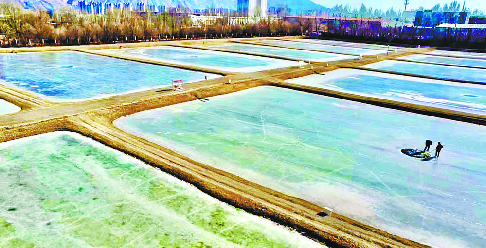 陽光透過冰面照射在18口冰封的魚塘里,為過冬的小魚苗增氧增溫。這片池塘是裸鯉來到裸鯉救護中心的第一站,田文根是這里的一名工作人員,主要負責室外原種場魚苗的培育和水質監測工作。據他介紹,魚塘的水質決定著魚苗的健康狀況。在冬季,及時掃雪是一項非常重要的工作,因為冰層下面的裸鯉魚苗是靠浮游植物通過光合作用產生的氧氣生存,如果雪附著在冰層上,陽光無法透進,就容易造成缺氧。
