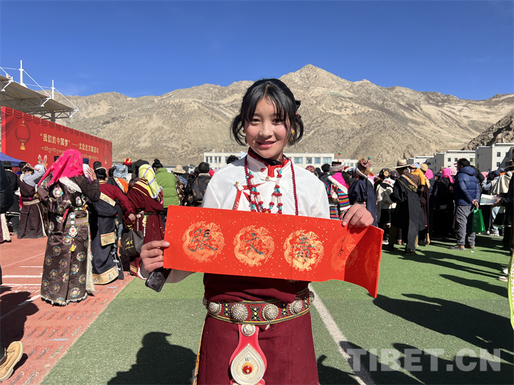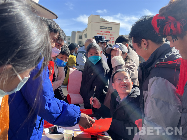 來到送“書法”現場,書法家們早早地來到活動現場,他們準備筆墨、鋪開紙張,為現場群眾書寫藏、漢文新年對聯,“?!弊帧ⅰ凹槿缫狻?、“扎西德勒”等寓意美好的祝福。書法家協會副主席祖牛拉巴次仁說:“從春節開始,我們書法家們去學校、社區、搬遷安置點等地,書寫了超過1萬件的書法作品。這些作品深受大家的喜愛,我們后續也會繼續開展送‘書法’公益活動”?,F場群眾聚集在送“書法”現場,“西熱措姆”“張文青”“索朗旺青”“朗嘎達瓦”……孩子們爭先恐后請書法家把自己的名字寫在紅紙上?!斑@是我的名字,我爸是西寧人,我媽是那曲的,我們是從那曲安多縣搬遷過來的,我現在在森布日幸福中學上初三,將來要考那曲高級中學”張文青拿著書家贈給她的“名字”用流利的那曲話對記者說。