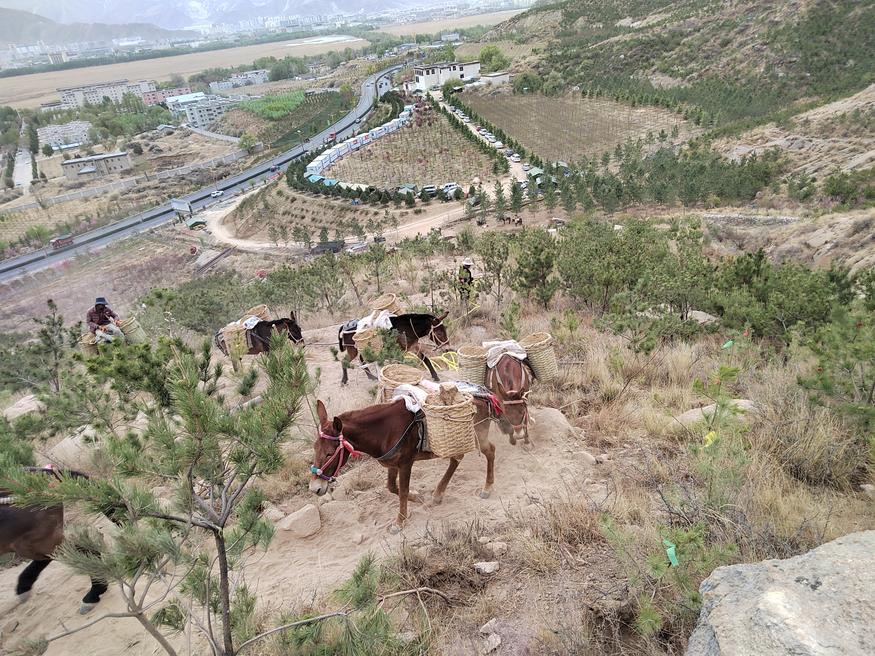 圖為騾隊在綠化片區運輸樹苗 圖片來源:西藏自治區慈善總會官網