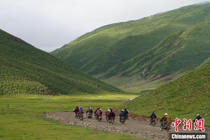 圖為青海省果洛州甘德縣藏族民眾騎著摩托前往山間采挖野生貝母。 馬銘言 攝