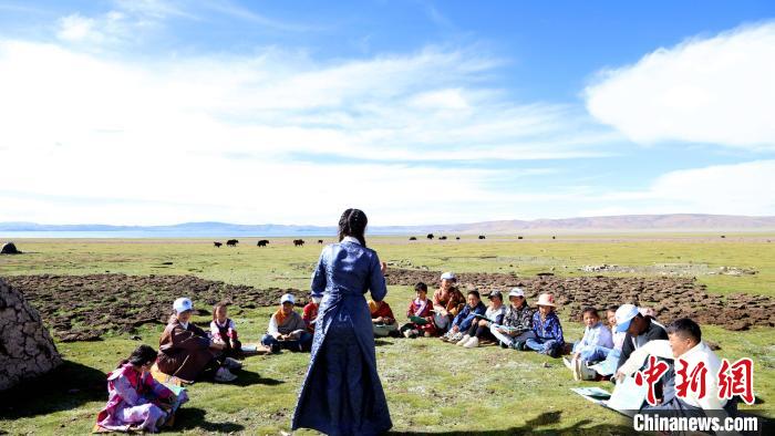 圖為青少年在納木錯湖畔的牧區共同閱讀《牛糞們的愿望》。拉薩市圖書館供圖