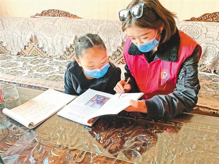 西藏那曲索縣“四講四愛”宣講團成員在進行入戶宣講的同時,積極開展送教活動。圖為索縣廣電中心副主任科員兼“四講四愛”辦工作人員次仁德吉入戶為學生輔導課后作業。記者 萬靖 張宇 攝