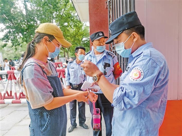 圖為在拉薩中學考點門口,工作人員對即將進入考點熟悉環境的考生進行體溫檢測和身份驗證。記者 王莉 攝