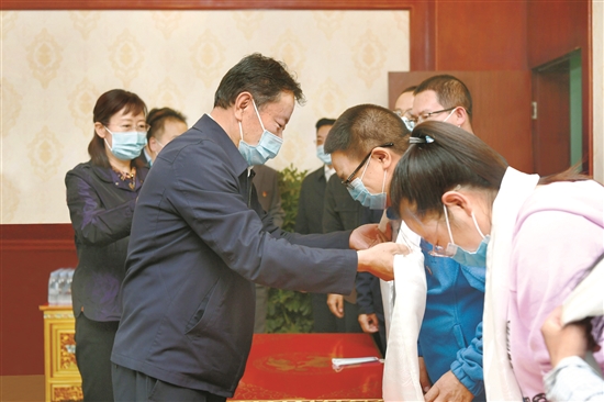 9月10日上午,區黨委常委、拉薩市委書記白瑪旺堆看望慰問離退休和辛勤工作在教育一線的教師代表,并通過他們向全市廣大教師和教育工作者致以節日的祝賀和誠摯的問候。圖為在拉薩市北京中學,白瑪旺堆為教師代表一一獻上哈達。 拉薩融媒記者 平措旺堆攝