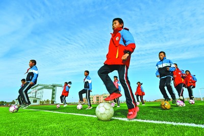 甘肅省民樂生態(tài)工業(yè)園區(qū)學(xué)校足球場上,學(xué)校足球隊(duì)的孩子們進(jìn)行傳球、帶球訓(xùn)練。王將攝/光明圖片
