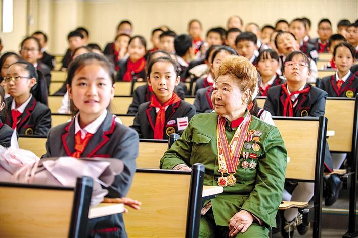 圖為抗美援朝老戰士楊秀珍與云大附中星耀學校小學部師生一同參加抗美援朝英雄故事分享會。新華社記者 江文耀 攝