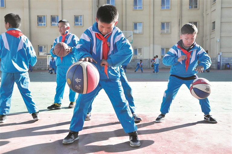 三年級4班學生嘉央群培報了籃球項目。他說:“我喜歡打籃球,每天寫完作業,都會在院子里打籃球,我想通過打籃球長身體。”