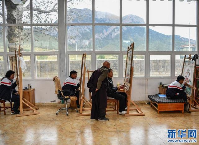 嘎瑪?shù)吕绽先嗽谖鞑夭际锌ㄈ魠^(qū)嘎瑪鄉(xiāng)的民族手工藝培訓基地里教學員們畫唐卡(10月3日攝)。新華社記者 晉美多吉 攝