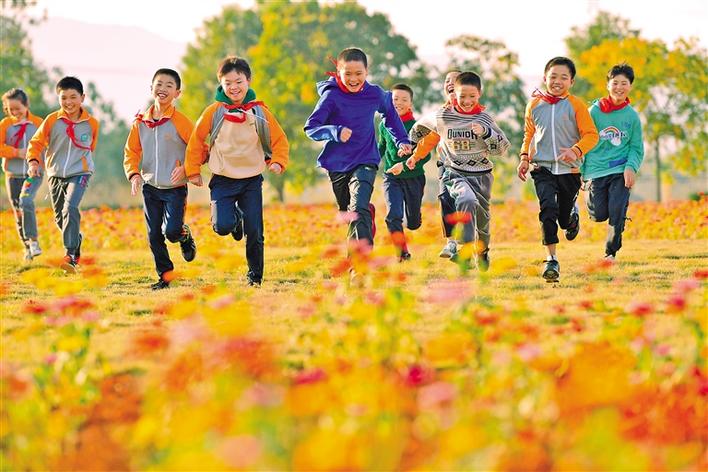 在江西省宜春市袁州區寨下中心小學,學生們在花田邊玩耍(11月9日攝)。新華社記者 彭昭之 攝